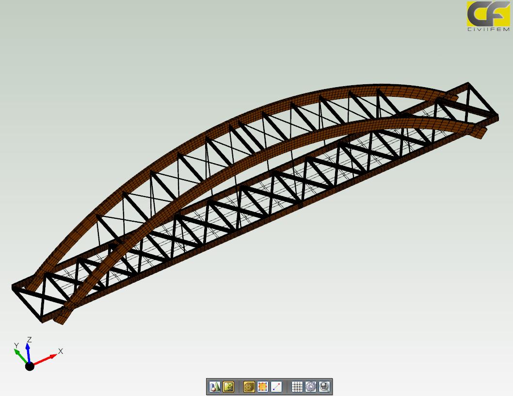 木制人行桥桥面基于两个侧梁。桥面通过钢支撑将传输的负载分摊到两平行拱结构上。两拱由支撑桁架连接。此设计完成了静态的析和模态分析,从而评估不同的设计用力和力矩,挠度,并获得结构的固有频率。为了模拟行人的步进速度进行了瞬态分析。