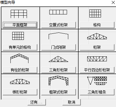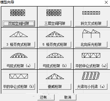STRAP模型库里的标准模型结构有平面框架、格构、各种桁架等:
